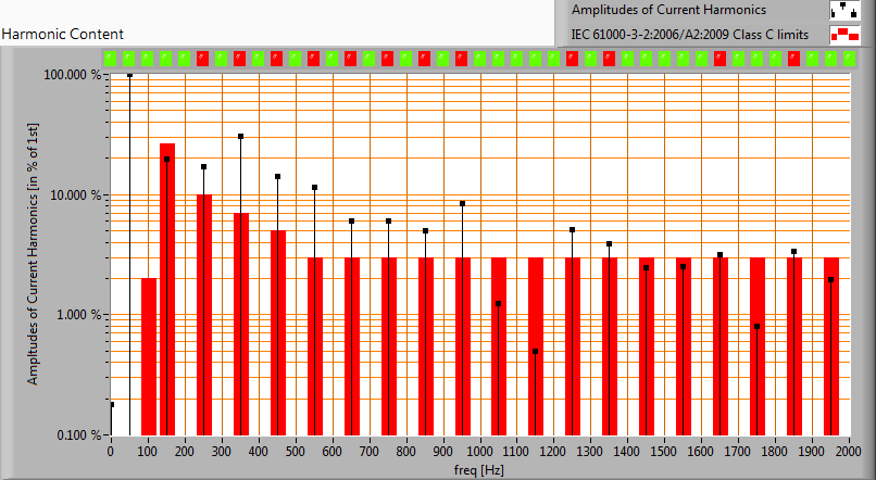 Harmonics in the current waveform and checked against IEC61000-3-2:2006 and A2:2009
