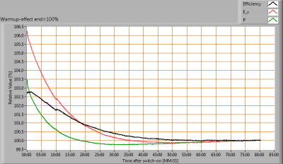 the variation in efficacy during the warming up is -3 %. A very high negative value indicates a significant decrease for instance due to heating up of the lamp (decrease of lifetime).