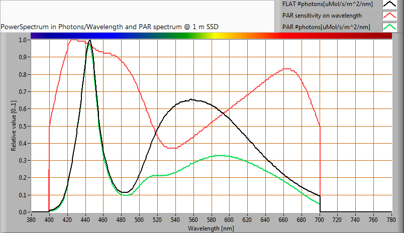 The PAR efficiency is 66 % (valid for the PAR wave length range of 400 – 700 nm). This is the maximum percentage of the total of photons in the light that is effectively used by the average plant (since the plant might not take 100 % of the photons at the frequency where its relative sensitivity is 100 %).