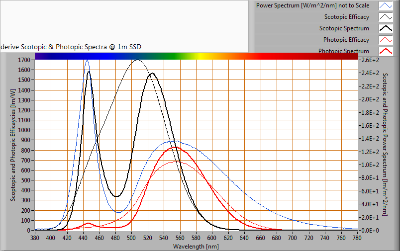 The power spectrum, sensitivity curves and resulting scotopic and photopic spectra (spectra energy content defined at 1 m distance).