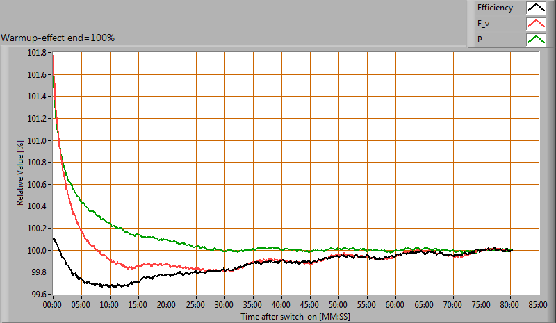After switch on of a cold lamp, the effect of heating up of the lamp is measured on illuminance E_v [lx], the lamppower P [W] and the luminous efficacy [lm/W].