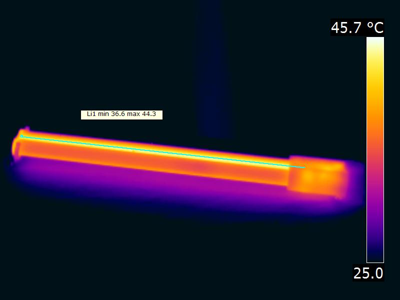 | General remarks | The ambient temperature during the whole set of illuminance measurements was 23.4 – 25.7 deg C.The temperature of the housing gets maximally about 20.5 degrees hotter than ambient temperature.Warm up effect: During the warmup time the illuminance doesn’t vary significantly (< 5 %).During the warmup time the power doesn’t vary significantly (< 5 %). The variation in efficacy (calculated as indication by simplydividing the illuminance by the power) during the warming up is -1 %. A very high negative value indicates a significant decrease for instance due to heating up of the lamp (decrease of lifetime).Voltage dependency: There is no (significant) dependency of the illuminance when the power voltage varies between 200 – 250 V AC. There is no (significant) dependency of the consumed power when the power voltage varies between 200 – 250 V AC.At the end of the article an additional photo. |