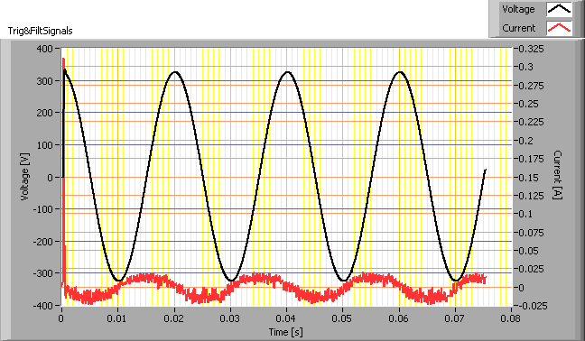 The inrush current has been measured for different voltage start angles; from 0 – 170 degrees with a 10 degrees step. The current- and voltage values have been acquires at a sample speed of 39.9 kS/s. Then this data has been fed into a second order 2kHz low pass Butterworth filter. This removes the current spikes that do not represent relevant values.