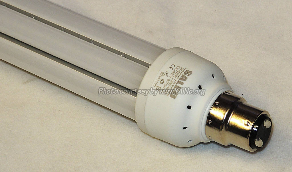 SALED presents an LED lamp. The measurements from OliNo show that the lamp emits a warm/neutral white light with a color temperature of 3976 K. The lamp consumes 29.8 W and has a luminous flux of 3099 lm. This results in an efficacy of 104 lm/W. The lamps energy category label is A+.