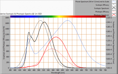 The power spectrum, sensitivity curves and resulting scotopic and photopic spectra (spectra energy content defined at 1 m distance).