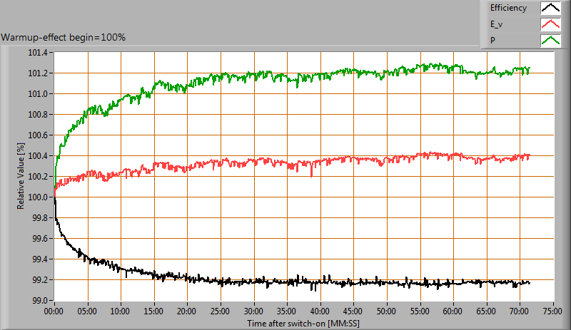 After switch on of a cold lamp, the effect of heating up of the lamp is measured on illuminance E_v [lx], the lamppower P [W] and the luminous efficacy [lm/W].