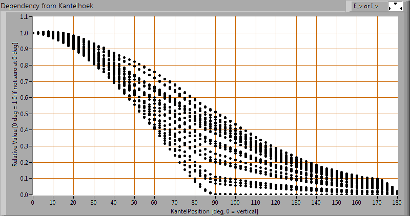 This plot shows per inclination angle the intensity measurement results for each turn angle at that inclination angle. There normally are differences in illuminance values for different turn angles. However for further calculations the averaged values will be used.
