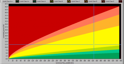 The lamp’s performance in the lumen-Watt field, with the energy efficacy fields indicated.