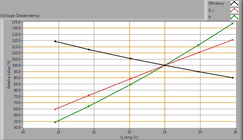 During the warmup time the power doesn’t vary significantly (< 5 %). Voltage dependency: There is a constant dependency of the illuminance when the power voltage varies between 22 – 26 V DC. At the end of the article an additional photo. |