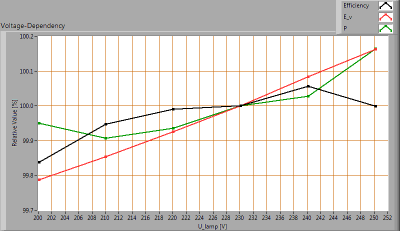 The dependency of a number of lamp parameters on the lamp voltage is determined. For this, the lamp voltage has been varied and its effect on the following light bulb parameters measured: illuminance E_v [lx], the lamppower P [W] and the luminous efficacy [lm/W] (this latter is estimated here by dividing the found E_v value by P).