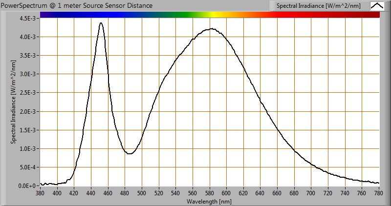 The spectral power distribution of this light bulb, energies on y-axis valid at 1 m distance.