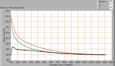 After switch on of a cold lamp, the effect of heating up of the lamp is measured on illuminance E_v [lx], the lamppower P [W] and the luminous efficacy [lm/W].