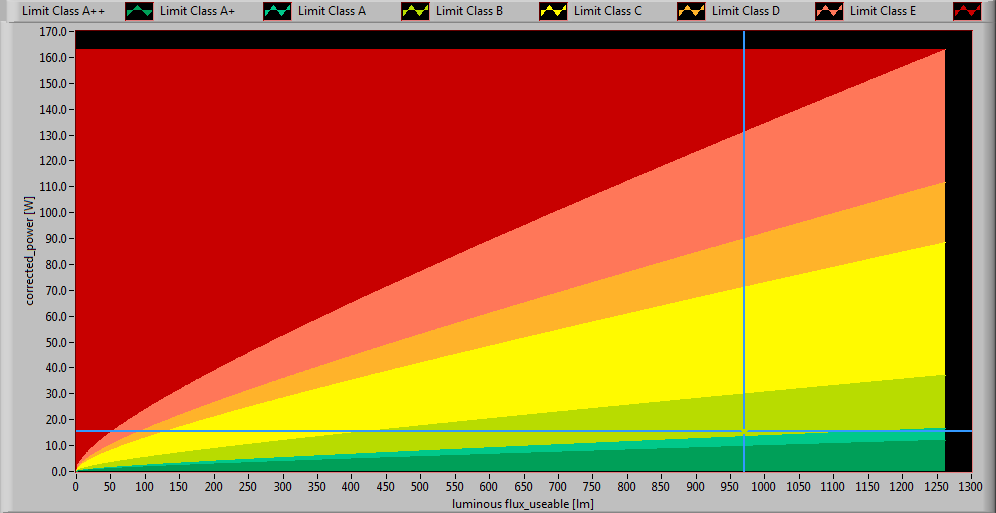 The lamp’s performance in the lumen-Watt field, with the energy efficacy fields indicated.