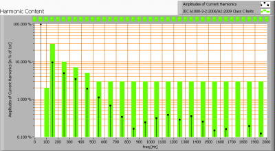Harmonics in the current waveform and checked against IEC61000-3-2:2006 and A2:2009