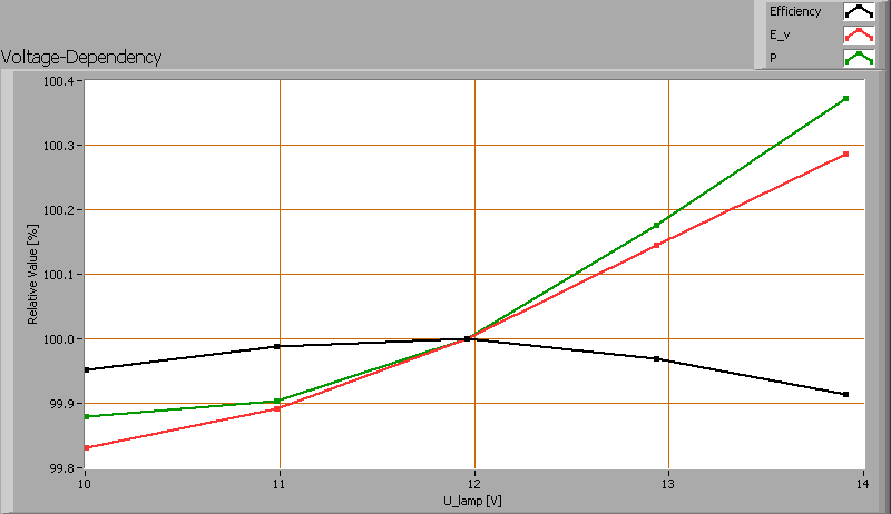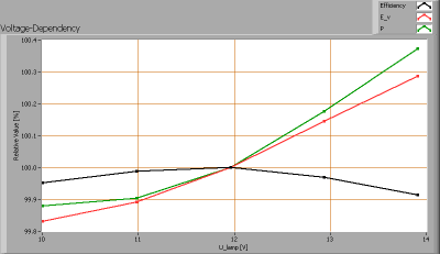 Für die Lampe wurde gemessen, wie stark die Parameter Beleuchtungsstärke E_v (in Lux, lx) und der netto Verbrauch an elektrischer Leistung P (in Watt, W) in Abhängigkeit von der Betriebsspannung schwanken. Aus dem Quotienten von E_v durch P wurde der Wirkungsgrad abgeschätzt.