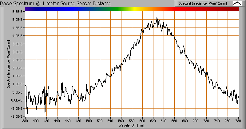 Das Farbspektrum des Lichtes dieses Lampe. Energieniveaus bei 1 Meter Abstand.
