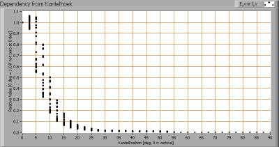 Hier der Plot der gemittelten Lichtstärke I_v abhängig vom Winkel der Messung gegenüber der Lampe: Alle Lichtstärkemessungen für 1 Kippwinkel für alle möglichen Drehwinkel ergeben den Mittelwert für diesen Kippwinkel. Aus dieser Grafik kann die Helligkeit in Candela (Cd) direkt abgelesen werden.