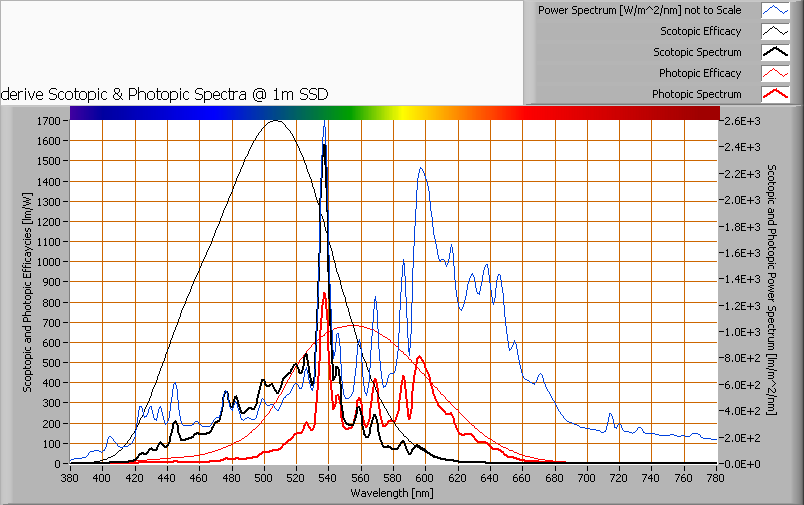 Das Leistungsspektrum, die Empfindlichkeitskurven und die daraus resultierenden Tag- und Nachtsichtspektra auf 1 Meter Abstand.
