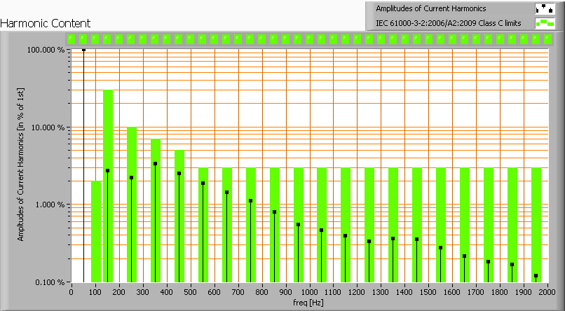 Die Harmonischen des Stroms im Vergleich zu den Anforderungen der EU Norm IEC 61000-3-2:2006 A2:2009.
