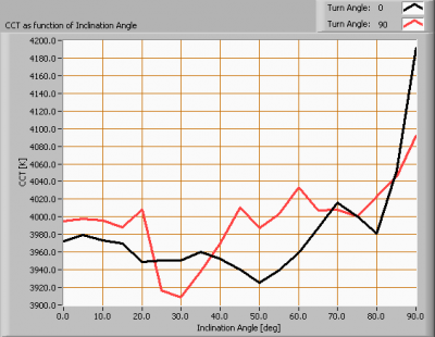 The color temperature is given for inclination angles up to 90 deg. Beyond that angle has not been measured.