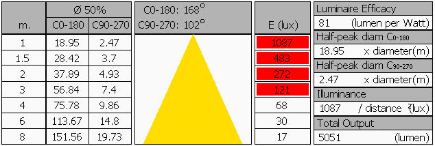 This light diagram below comes from the program Qlumedit, that extracts these diagrams from an Eulumdat file.
