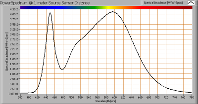 Das Farbspektrum des Lichtes dieses Lampe. Energieniveaus bei 1 Meter Abstand.