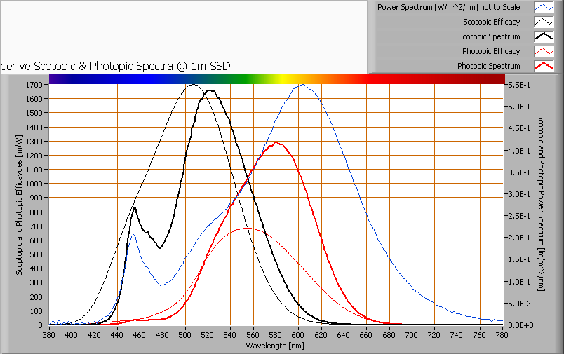 The power spectrum, sensitivity curves and resulting scotopic and photopic spectra (spectra energy content defined at 1 m distance).