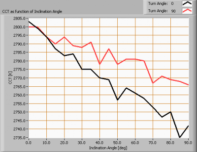 The color temperature is given for inclination angles up to 90 deg. Beyond that angle has not been measured.