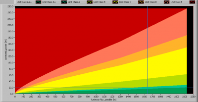 The lamp’s performance in the lumen-Watt field, with the energy efficacy fields indicated.