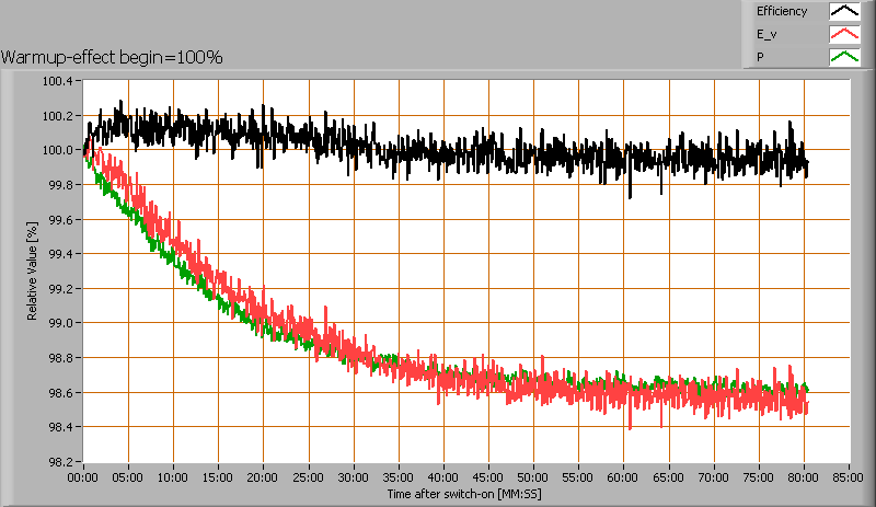 After switch on of a cold lamp, the effect of heating up of the lamp is measured on illuminance E_v [lx], the lamppower P [W] and the luminous efficacy [lm/W].