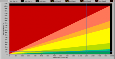 Der gemessene Lichtstrom ist 12876 lm. Die Klassifizierung dieser Lampe die benötigt ist um die Nutzlichtstrom zu bestimmen ist: Lampen mit ungebündeltem Licht. Denn der Nutzlichttrom wird 12048 lm. Nun kann ein Bezugsleistung berechnet werden.