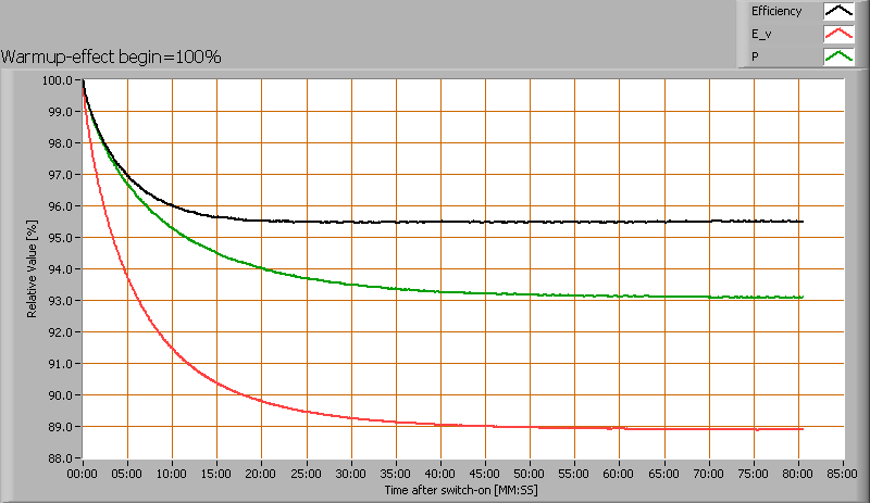 After switch on of a cold lamp, the effect of heating up of the lamp is measured on illuminance E_v [lx], the lamppower P [W] and the luminous efficacy [lm/W].