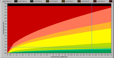 The lamp’s performance in the lumen-Watt field, with the energy efficacy fields indicated.