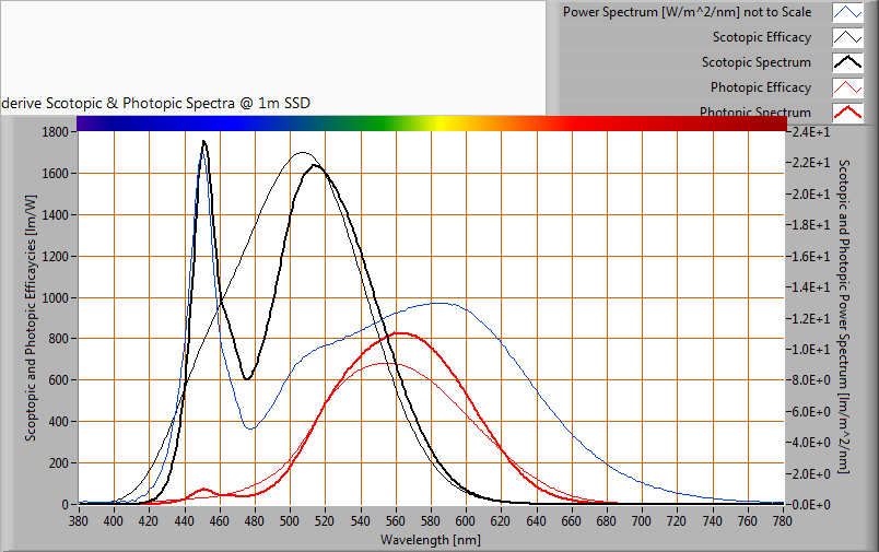 The power spectrum, sensitivity curves and resulting scotopic and photopic spectra (spectra energy content defined at 1 m distance).
