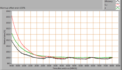 After switch on of a cold lamp, the effect of heating up of the lamp is measured on illuminance E_v [lx], the lamppower P [W] and the luminous efficacy [lm/W].
