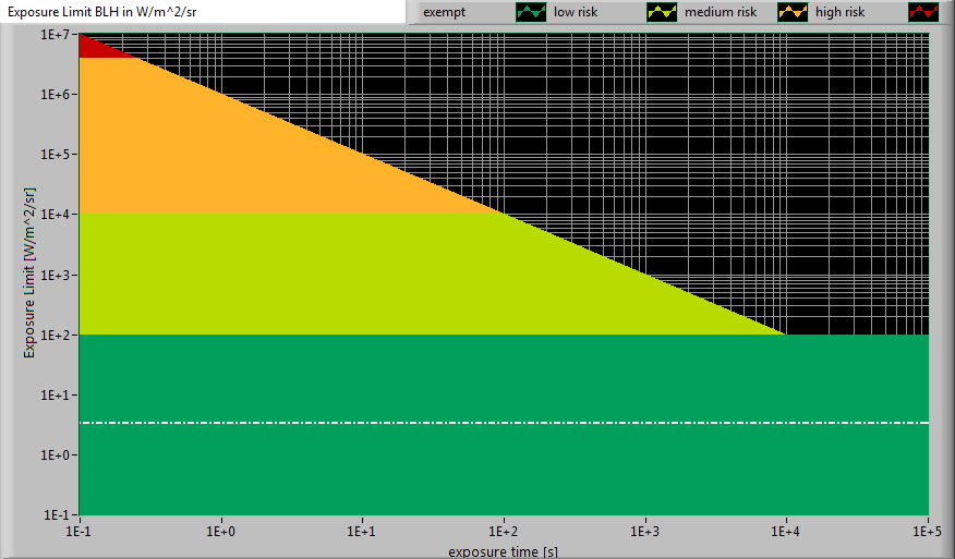 The level of blue light of this lamp related to the exposure limit and the different classification areas.