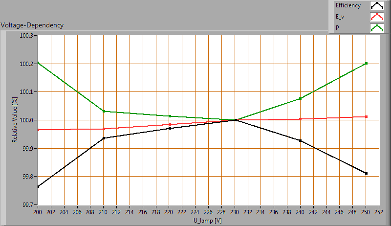 After switch on of a cold lamp, the effect of heating up of the lamp is measured on illuminance E_v [lx], the lamppower P [W] and the luminous efficacy [lm/W].