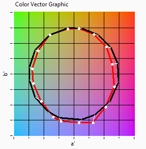 Graphical view of averaged color points for this light bulb compared to a reference source with the same color temperature.