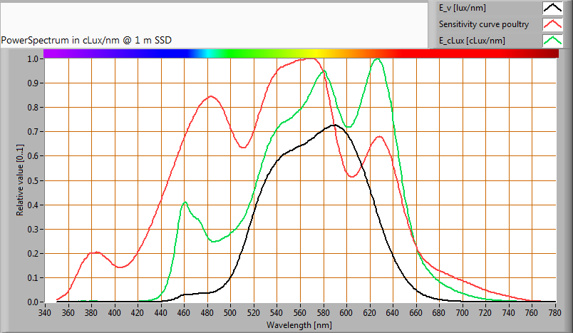 The energy in the spectrum of the light of the lamp can be evaluated by the spectral sensitivity of the eye of chicken (N.B. Prescott and C.M. Wathes, 1999 and J. E. Saunders, J. R. Jarvis and C. M. Wathes, 2008).