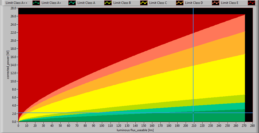 The lamp’s performance in the lumen-Watt field, with the energy efficacy fields indicated.