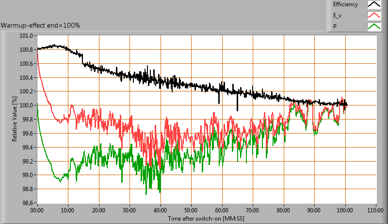 After switch on of a cold lamp, the effect of heating up of the lamp is measured on illuminance E_v [lx], the lamppower P [W] and the luminous efficacy [lm/W].