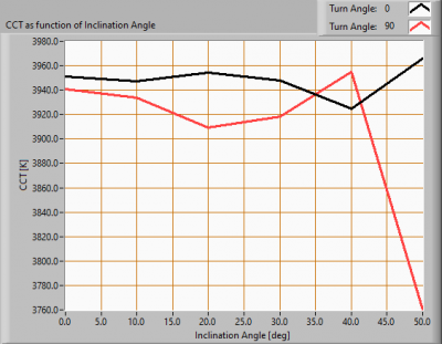 This color temperature is measured straight underneath the light bulb. Below a graph showing the color temperature for different inclination angles.