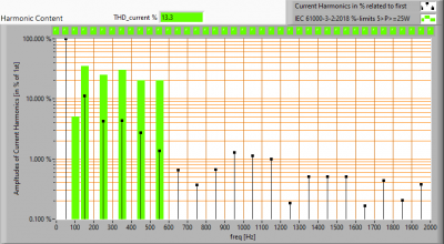 This current waveform has been checked on requirements posed by the norm IEC 61000-3-2:2018. This norm contains requirements for lamps with a power 5 W, 5 – 25 W and > 25 W. This lamp consumes 15.9 W.