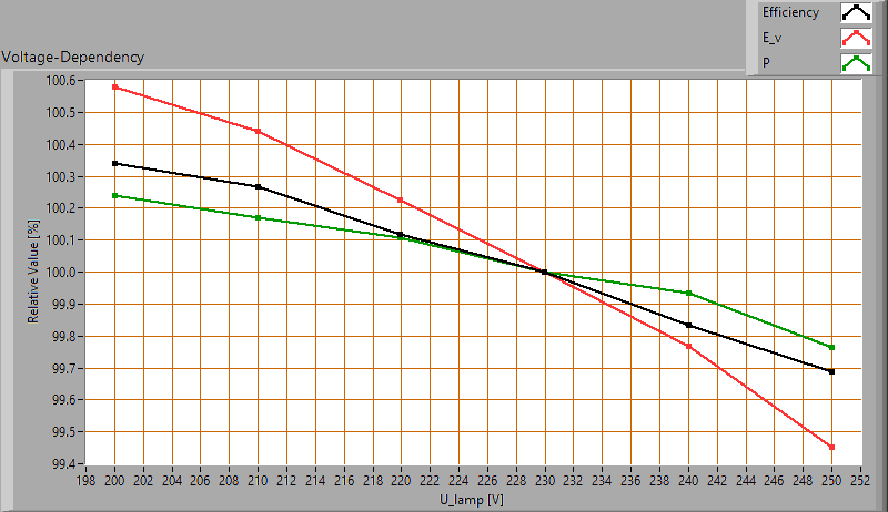 After switch on of a cold lamp, the effect of heating up of the lamp is measured on illuminance E_v [lx], the lamppower P [W] and the luminous efficacy [lm/W].