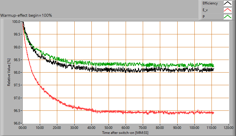 After switch on of a cold lamp, the effect of heating up of the lamp is measured on illuminance E_v [lx], the lamppower P [W] and the luminous efficacy [lm/W].