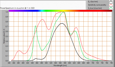 The energy in the spectrum of the light of the lamp can be evaluated by the spectral sensitivity of the eye of chicken (N.B. Prescott and C.M. Wathes, 1999 and J. E. Saunders, J. R. Jarvis and C. M. Wathes, 2008).